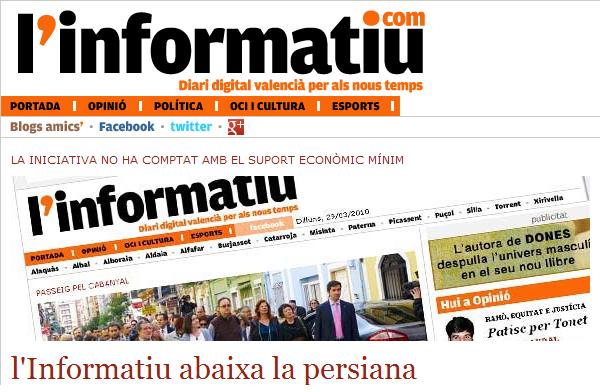 L’Informatiu, que salió a la luz por primera vez el 30 de noviembre de 2009, aportaba otra visión de la actualidad valenciana, apostando por la lengua autóctona y una temática comprometida socialmente. Esta implicación con la sociedad, como no podía ser de otra manera, se vio respaldada por los lectores, 200.000 usuarios únicos y un seguimiento en redes sociales espectacular. No ha sido así, en cambio y por desgracia, con el soporte publicitario.